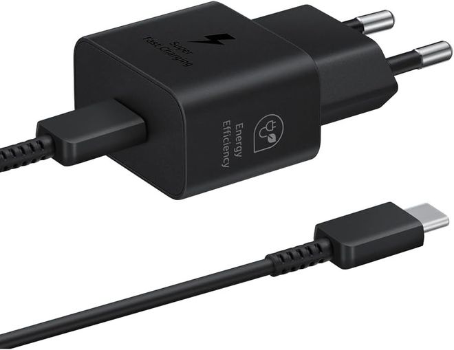 O carregador original da Samsung de 25 W com tecnologia Super Fast Charging, via porta USB-C. É um modelo de confiança e mais acessível que as potências maiores.