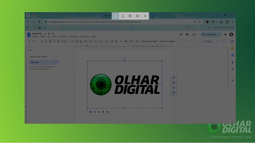 Diferente de outros editores, como Word ou LibreOffice, o Google Docs não permite clicar com o botão direito diretamente sobre a imagem e selecionar “Salvar como…”, pois o menu de contexto que aparecerá é o do próprio sistema da plataforma.