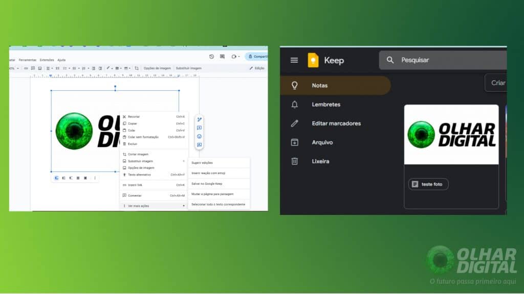 - Clique com o botão direito do mouse sobre a imagem desejada dentro do Google Docs. No menu que aparecer, selecione a opção “Salvar no Keep”.