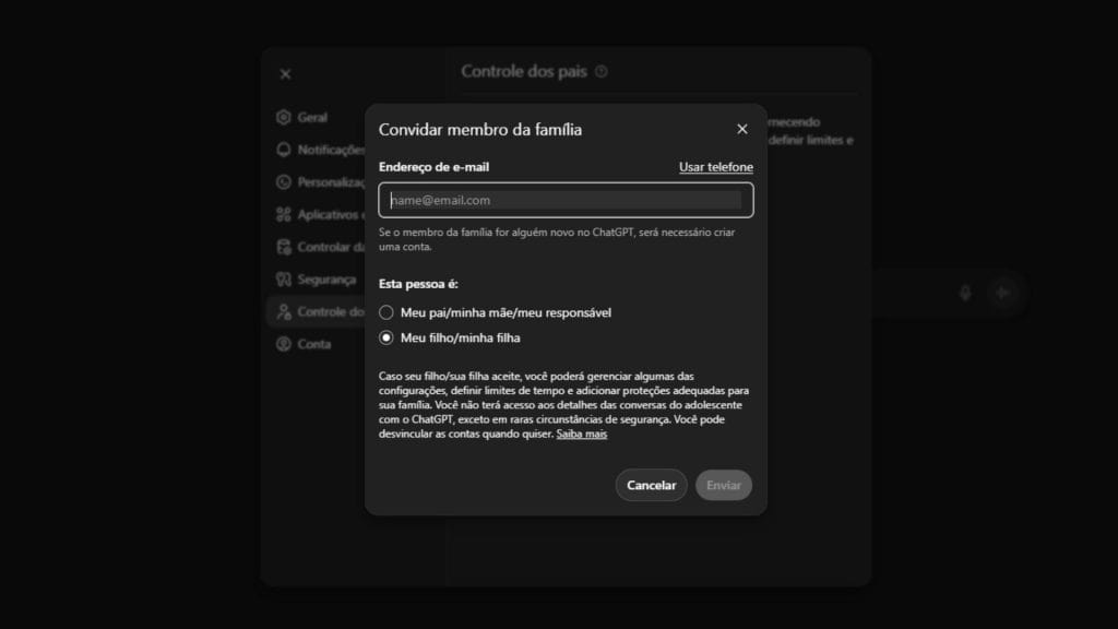 - Insira o e-mail ou o número de telefone (SMS) associado à conta do ChatGPT do seu filho para enviar o convite de vinculação.