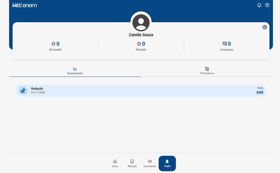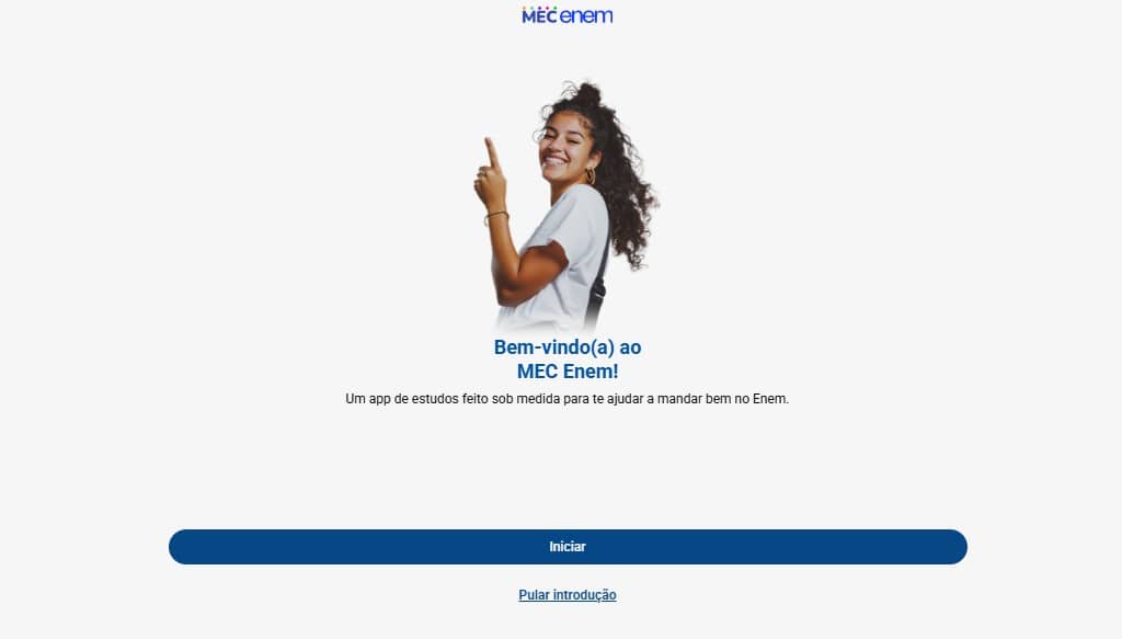 Abra o app MEC Enem no seu celular ou acesse a versão no navegador. Para usar as funções de correção de redação, é necessário realizar o acesso por meio de uma conta gov.br, porque esse login conecta seu perfil no app aos seus dados pessoais, registra seu histórico de simulados e redações e mantém tudo sincronizado.