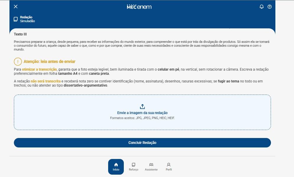 Para corrigir a redação, o usuário precisa ir até a aba específica dentro do app. Lá, ele encontra um tema sugestivo baseado em provas anteriores do ENEM, sendo que o MEC informa que esses temas são inspirados em edições passadas da prova. Depois disso, o aluno escreve o texto à mão em uma folha física, respeitando a forma tradicional de redação do exame, e então tira uma foto nítida desse texto.