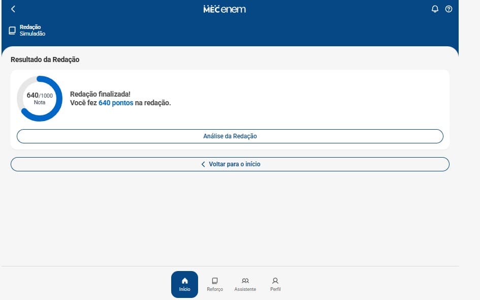 Pouco tempo após o envio, você receberá uma resposta da IA com uma nota estimada e comentários detalhados, indicando os pontos fortes da sua redação e sugestões de como melhorar.