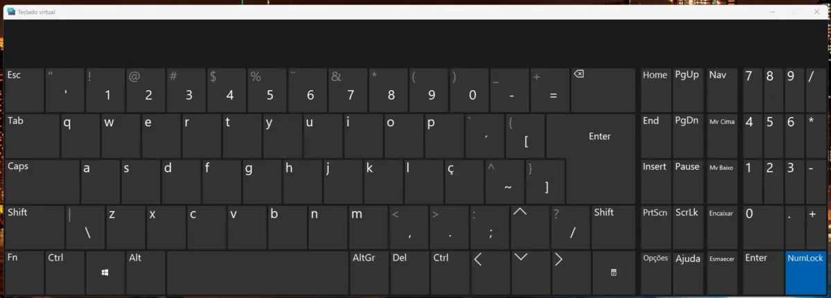 • Em notebooks, use a combinação Fn + F2 (ou equivalente) para ativar o Num Lock e, em seguida, utilize as letras U, I, O, J, K, L, M como substitutos dos números.