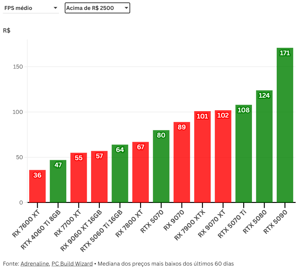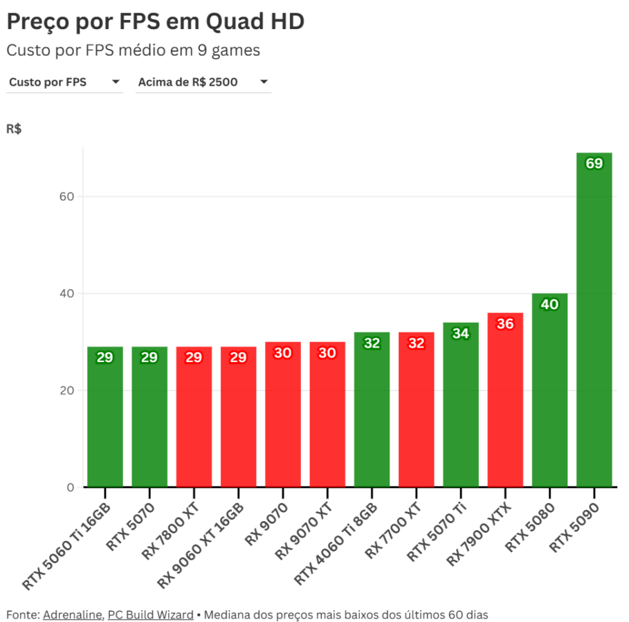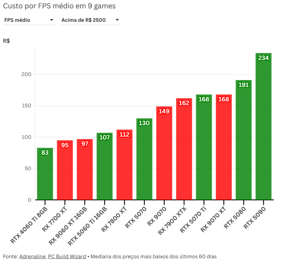 Enquanto a RX 9070 XT custa 30 reais por frame que gera, a RTX 5070 Ti custa R$ 34, a RTX 5080 sai por R$ 40 e a RTX 5090 sobe para insanos R$ 60!