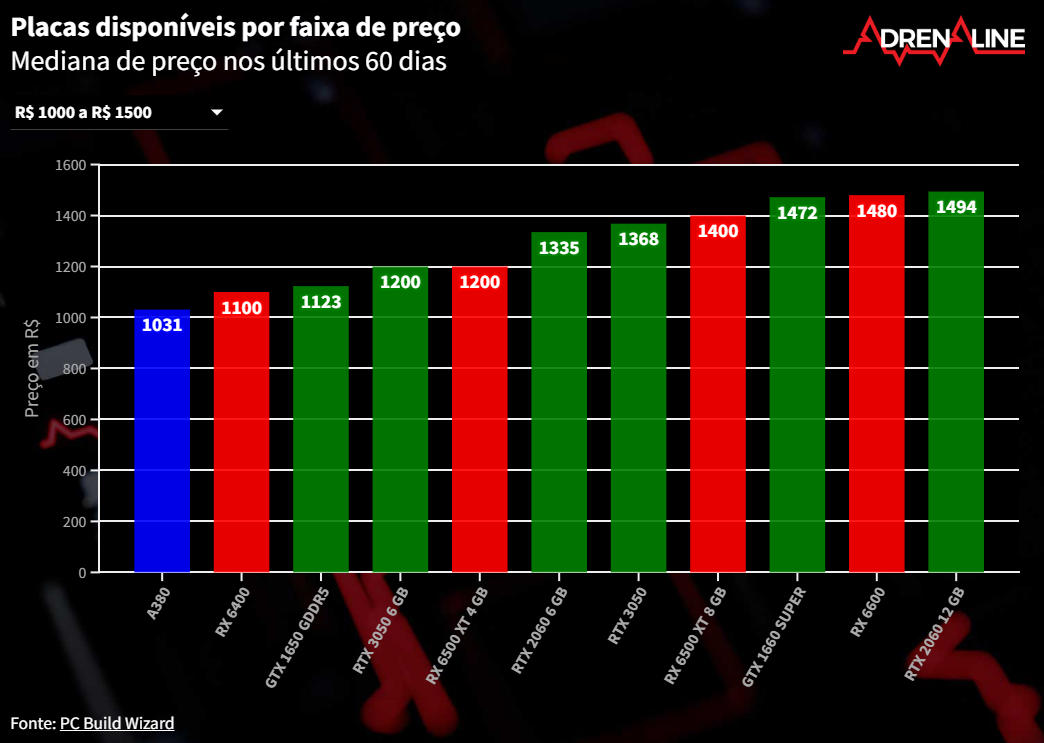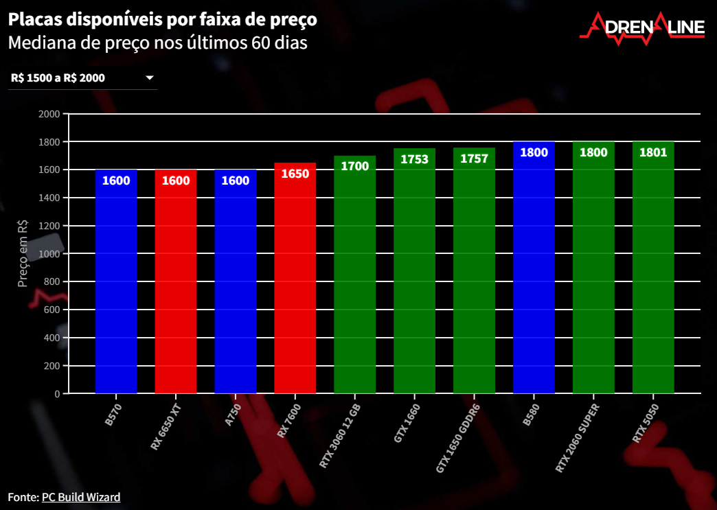 Até que tem uma galera aqui, não é mesmo? O segmento entre os R$ 1.000 e R$ 1.500 é composto principalmente por modelos do segmento de entrada com alguns anos no mercado, como a RTX 2060 ou GTX 1660 Super.