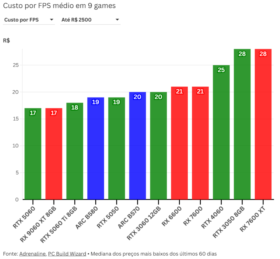 Chegamos aos campeões na relação entre custo e performance, e são o ponto ideal para quem quer jogar em 1080p. O pódio são da dupla GeForce RTX 5060 e Radeon RX 9060 XT, com apenas 17 reais pro frame que entregam.