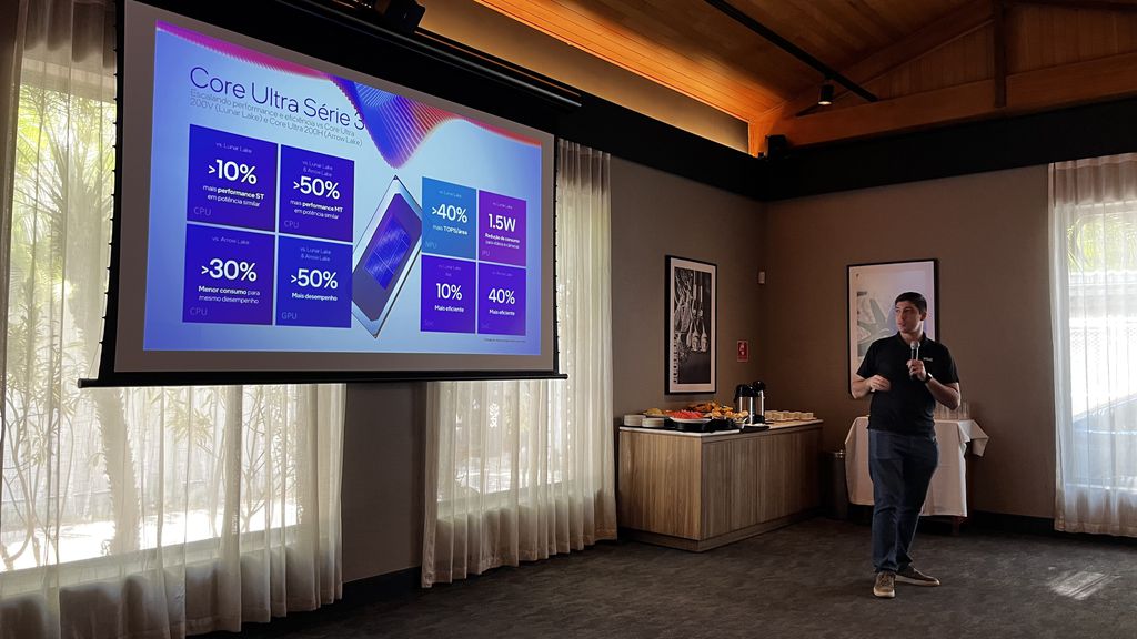 A grande promessa do Core Ultra Serie 3 é resolver um dilema antigo dos usuários de notebooks: a escolha entre bateria e desempenho bruto. Segundo Yuri Daglian, Engenheiro de Aplicações de Vendas da Intel Brasil, o objetivo é que o usuário tenha “um notebook com 20 horas de duração de bateria ou mais, mas, ao mesmo tempo, com grande quantidade de núcleos”.