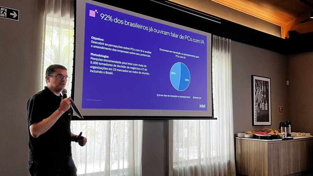 O evento também serviu para apresentar um panorama da Inteligência Artificial no mercado local. Uma pesquisa encomendada pela Intel revelou que 56% das empresas brasileiras já iniciaram a atualização para PCs com IA, um índice superior ao do México (46%) e acima da média das Américas (53%).