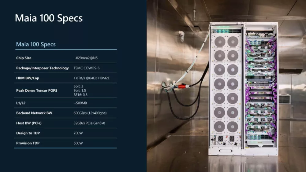 Os chips para processamento de IA da Microsoft fizeram sua estreia em 2024, na forma do Maia 100. O componente é fabricado pela TSMC, no processo de 5nm (N5), incorporando 64GB de memória HBM2E. A empresa estima performance de até 3 PetaOPS em testes de precisão de 6-bit e até 1,5PetaOPS em 9-bit.