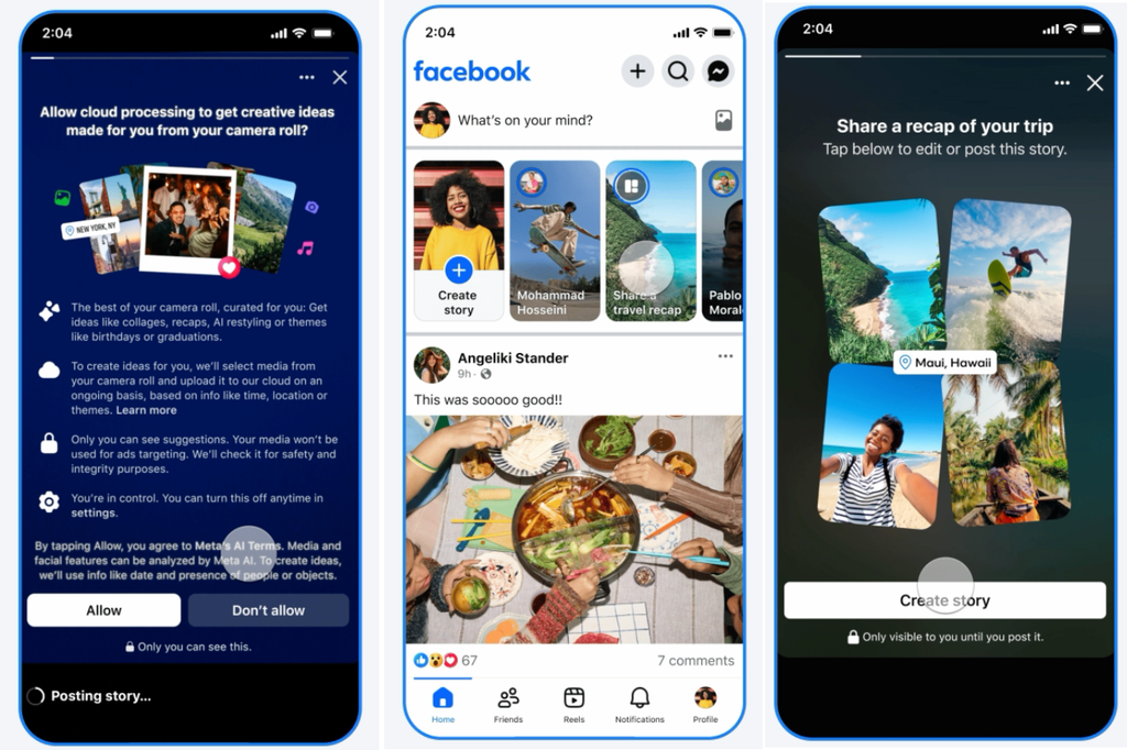 A novidade, já disponível nos Estados Unidos e Canadá, é uma ferramenta opt-in, ou seja, o usuário precisa aceitar participar. Após a ativação, o Facebook passa a ter acesso às mídias armazenadas no celular. A IA da Meta identifica fotos e vídeos que ficaram perdidos entre capturas de tela e imagens aleatórias e cria automaticamente montagens, colagens e edições criativas.