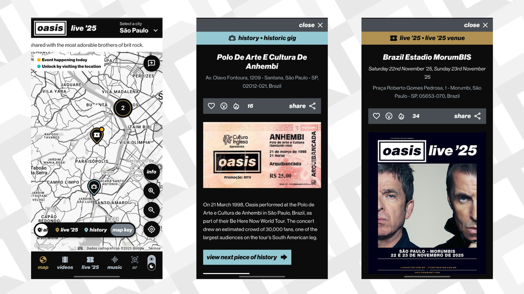 Por fim, é possível relembrar a história do Oasis em São Paulo com marcações nos locais que receberam shows do grupo no passado. Foram três ocasiões diferentes em 1998, 2006 e 2009, com direito a informações sobre a turnê na época e até uma foto dos ingressos.
