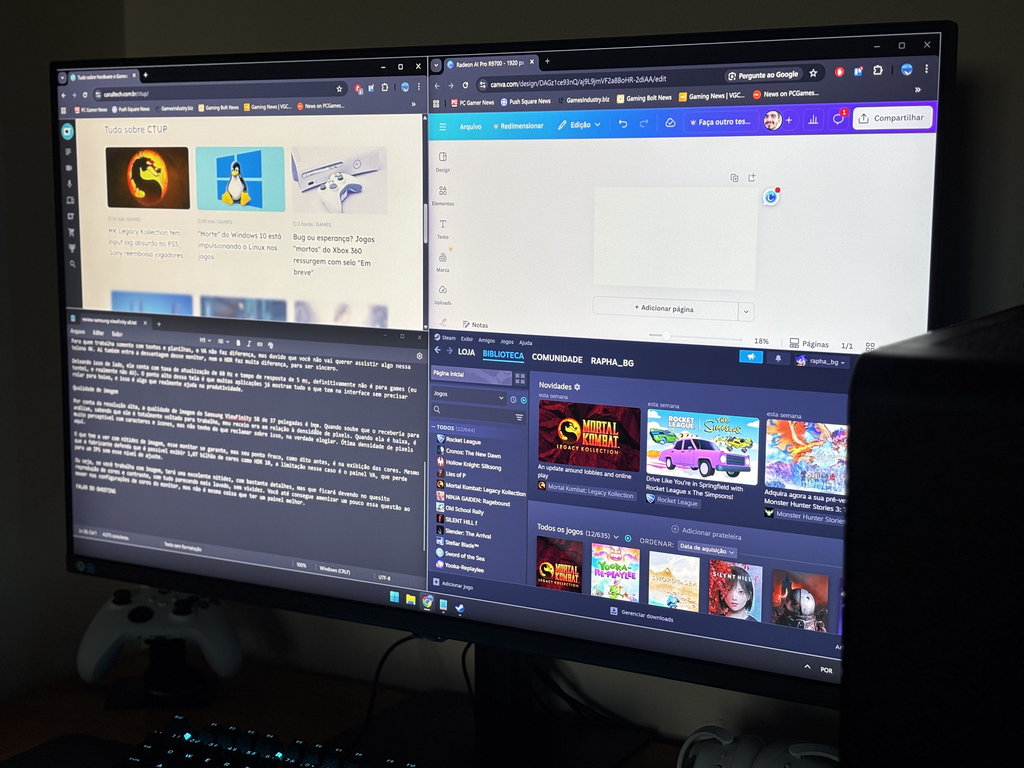 Mas o pior problema desse monitor é efeito ghosting, causado pelo tempo muito alto de reposta dos pixels. Esse problema é extremamente perceptível ao rolar a página e todos os elementos deixam um rastro na tela, algo que incomoda bastante e até gera um certo desconforto. Depois de passar tanto tempo usando monitores IPS e OLED com tempo de resposta menor do que 1 ms, isso é algo que realmente me pegou negativamente. Mesmo usando por dias, não consegui acostumar com isso.