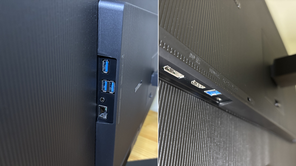 O Samsung ViewFinity S8 oferece diversas conexões, desde USB, HDMI e Display Port. Na lateral da parte traseira, o monitor oferece três USB-A, saída para microfone e entrada RJ-45. Já na parte debaixo, ele conta com um DisplayPort 1.2 e HDMI 2.2, além de um USB-B e USB-C, que permite transferência de arquivo e carregamento de 90W. Ou seja, esse modelo é bastante completo nesse sentido.