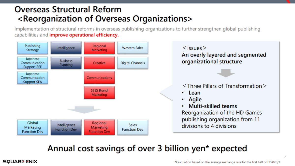 De acordo com o comunicado, a meta da Square Enix é economizar até 3 bilhões de ienes por ano, o equivalente a cerca de US$ 19,6 milhões, como parte da reestruturação de suas operações ocidentais.