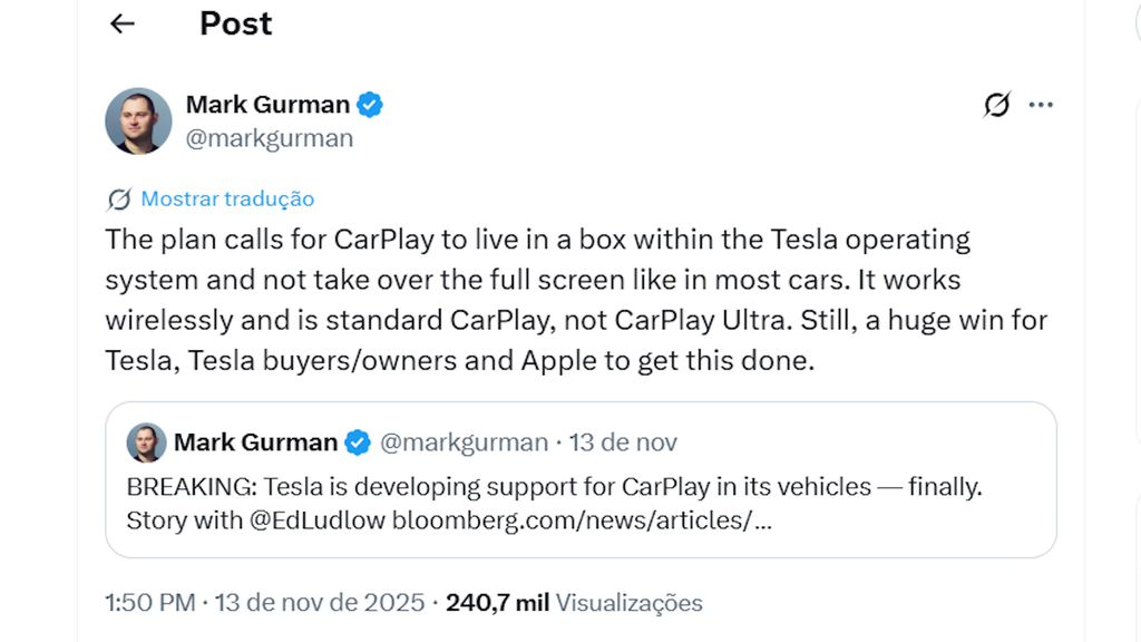 Adoção do Apple CarPlay em carros da Tesla deve acontecer em breve (Imagem: Reprodução/X, @markgurman)