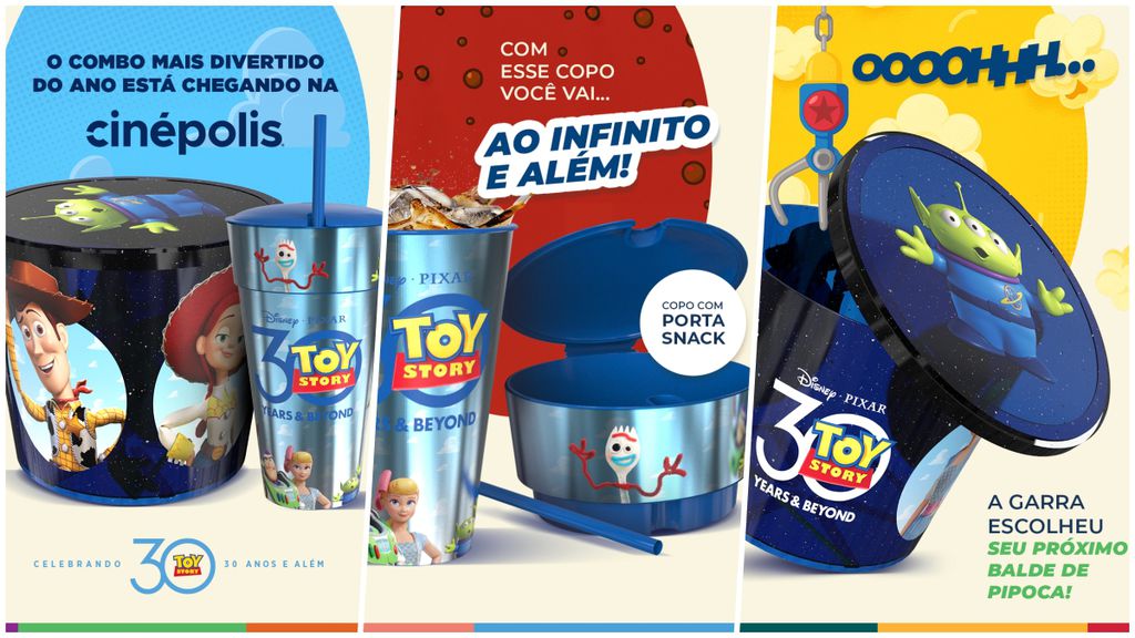 A Cinépolis anunciou um combo exclusivo de Toy Story que conta com balde ilustrado com alguns dos personagens icônicos da franquia (como Woody, Jessie, Betty e Alien), um copo azul metálico também com imagens dos personagens e um porta snack de mesmo tom com a imagem do Garfinho.