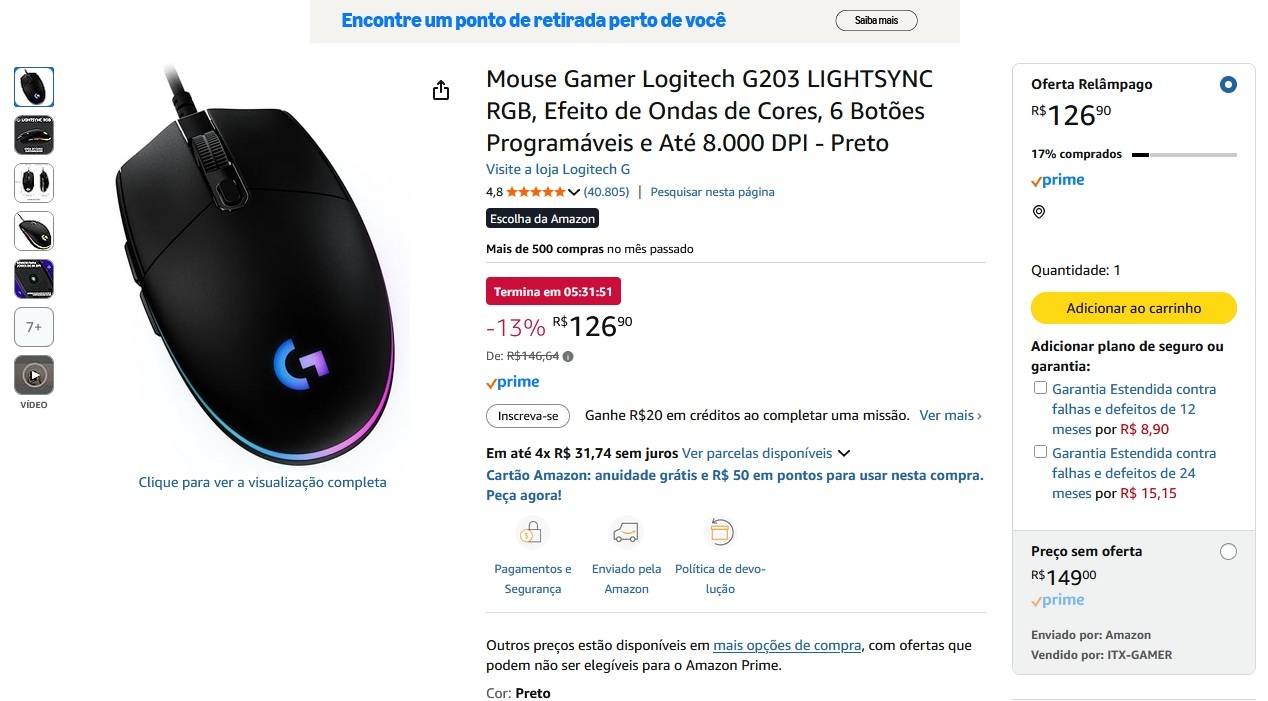 | Mouse Gamer Logitech G203 LIGHTSYNC RGB, Preto | R$ 126,90 |
