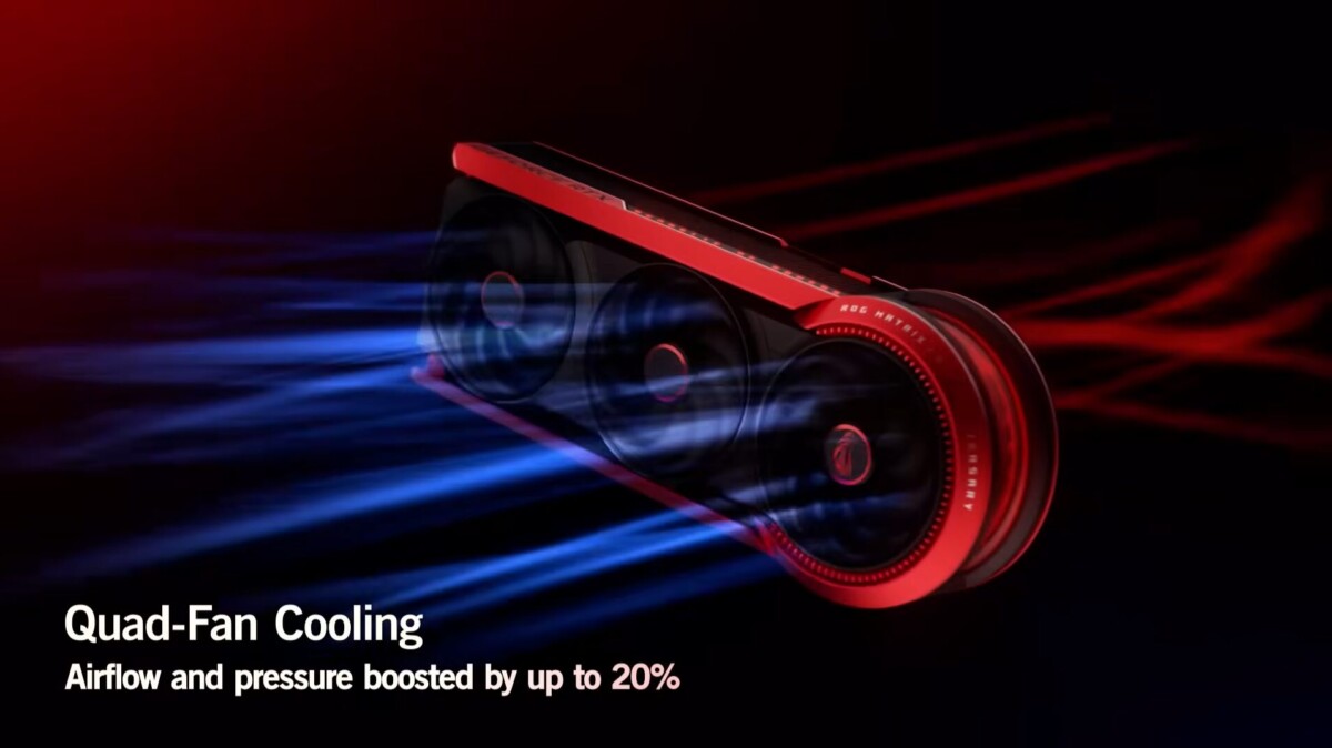 O sistema de refrigeração da placa é igualmente impressionante, composto por um dissipador de calor enorme e quatro ventoinhas em uma configuração 3+1, além da pasta térmica de metal líquido. O conjunto todo pesa cerca de 3,2 kg e é simplesmente gigantesco, com dimensões de 370 x 150 x 77 mm.