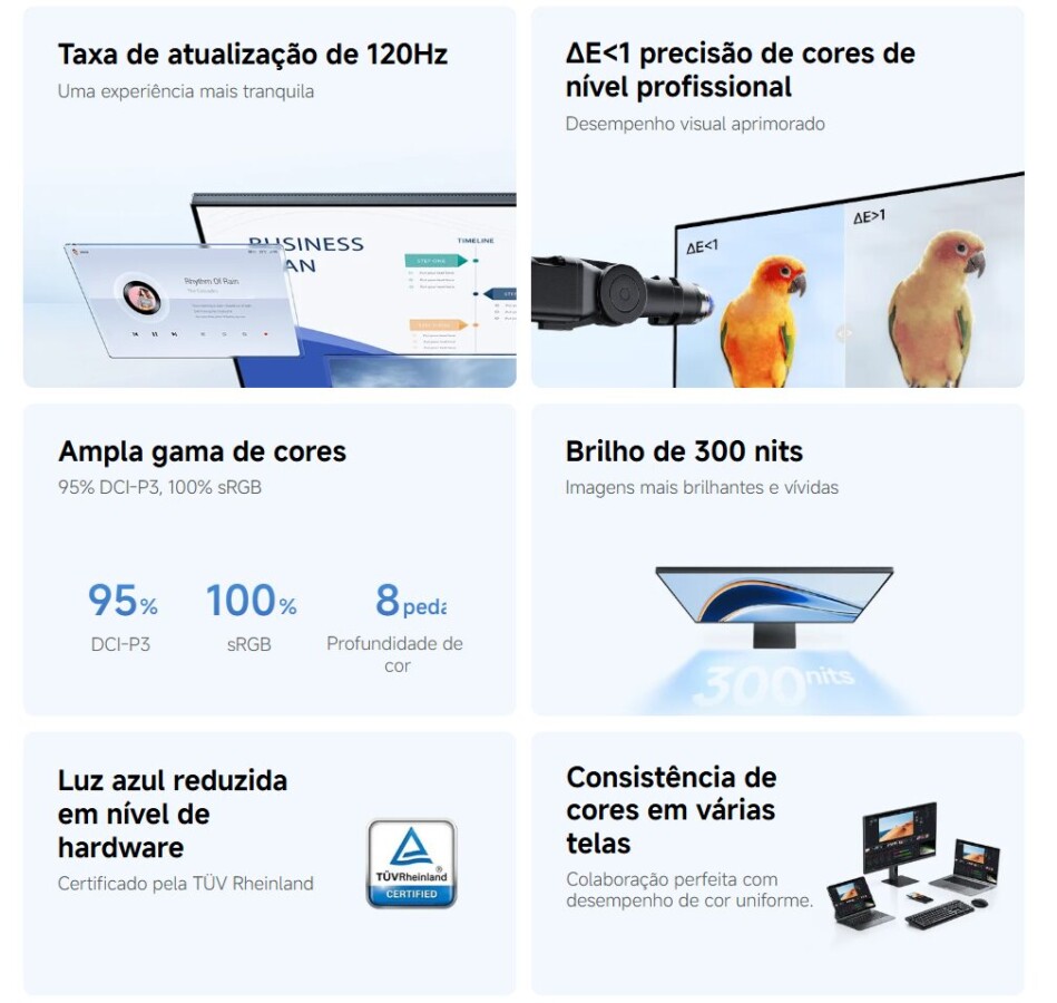 Precisão de cor ΔE<1 (calibrado individualmente em sRGB)