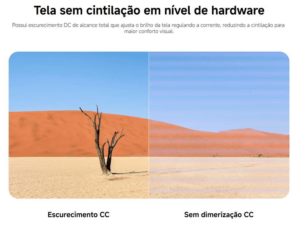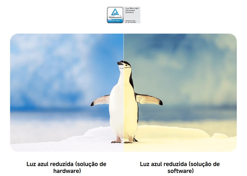 A combinação de redução de luz azul e ausência de cintilação visa diminuir incômodos comuns, como ardência ocular, dores de cabeça e percepção de tremulação em níveis de brilho baixos.