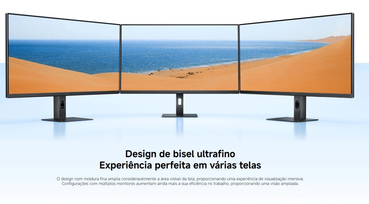 O monitor utiliza bordas ultrafinas em três lados, o que amplia a área útil e facilita o alinhamento em configurações com duas ou mais telas. Com 3,9 kg incluindo a base, mantém estrutura leve para mesas pequenas ou braços articulados compatíveis com VESA 75 × 75 mm.